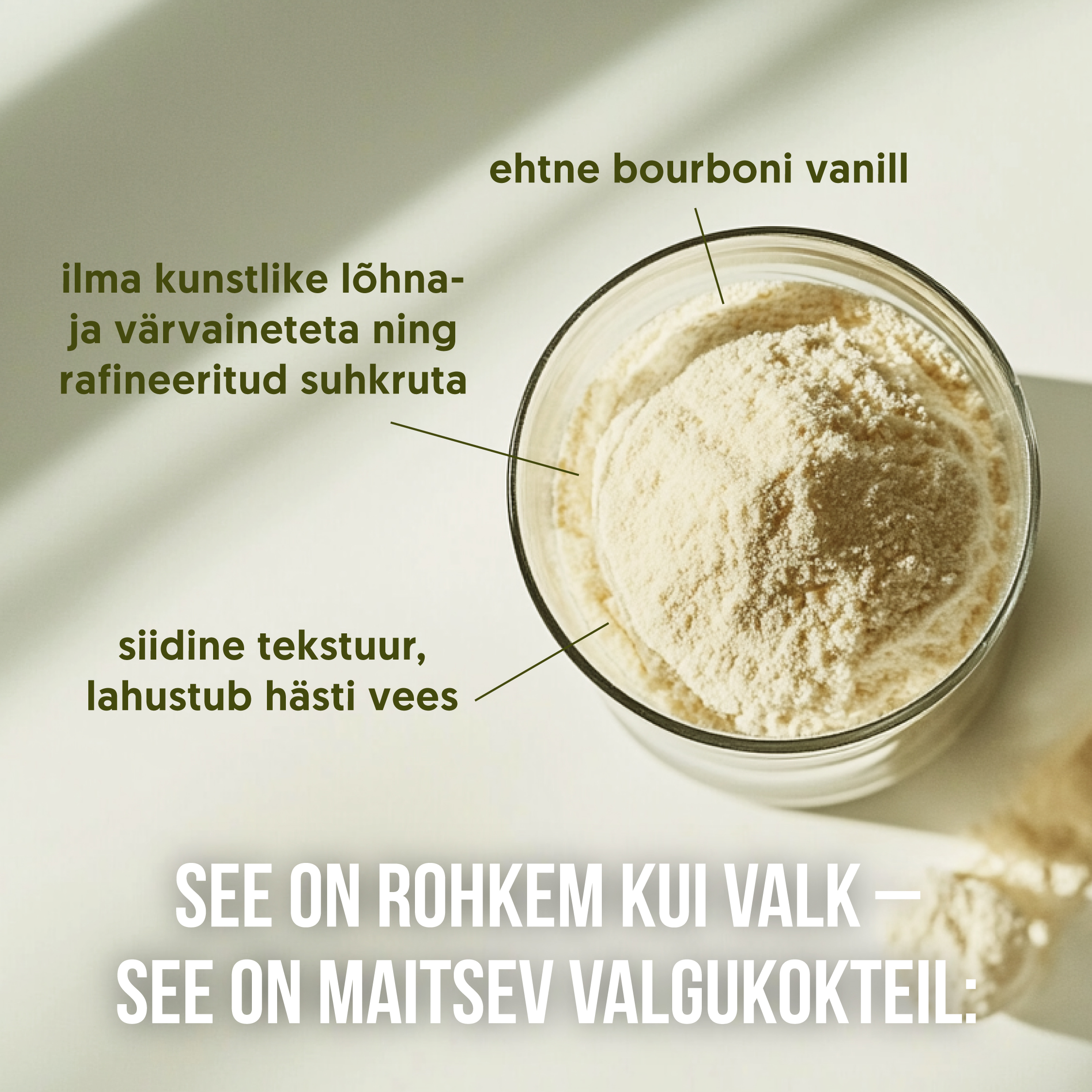 Sega 2 supilusikatäit (30 g) pulbrit 200 ml taimse joogi või veega ja naudi vanilje-bourbonimaitselist proteiinikokteili.